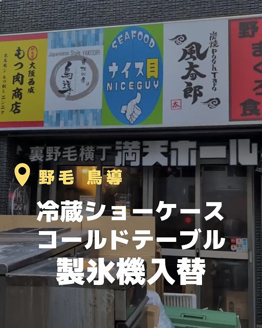 今回は野毛「鳥導」さんにて製氷機・コールドテーブル・冷蔵ショーケースをまとめて